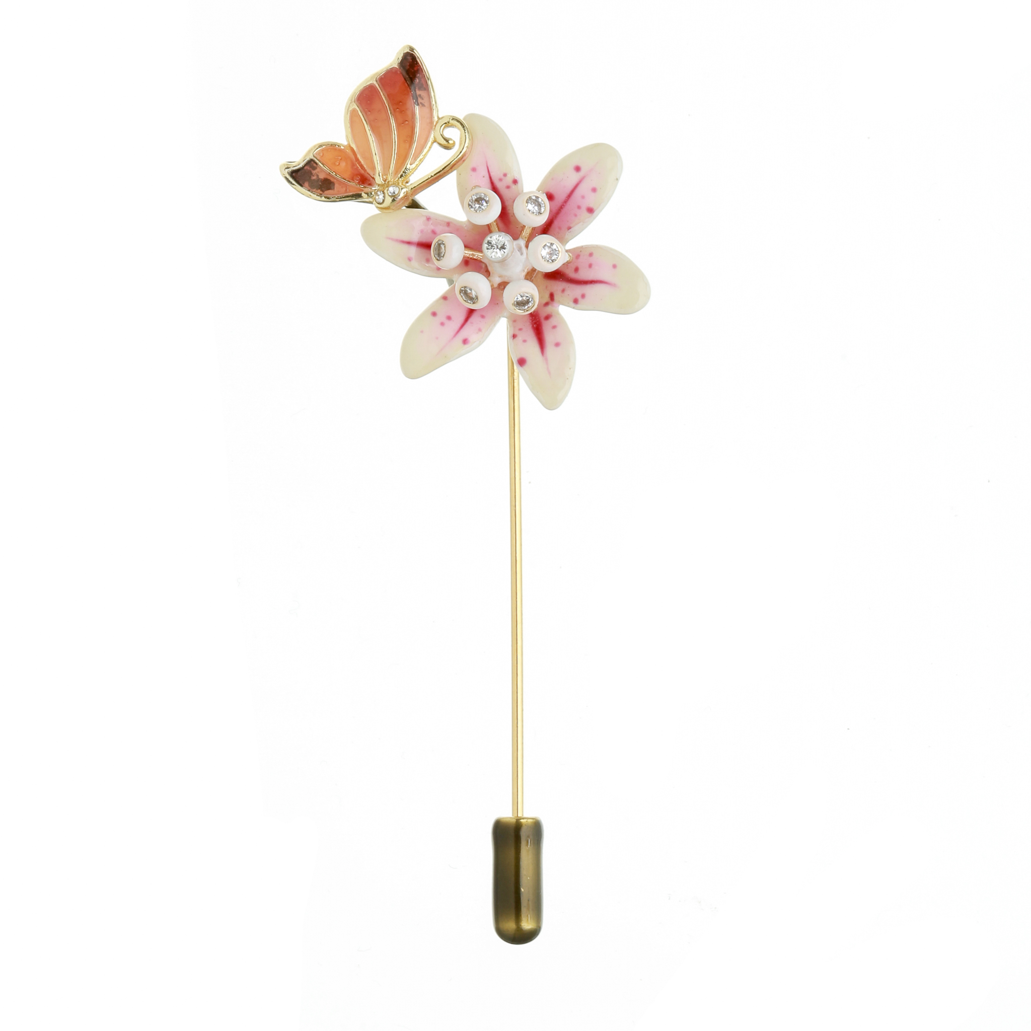 Pin in 925° silver, gold plated brass, glass, hand cut crystals, hot technique enamel, handmade in Italy.