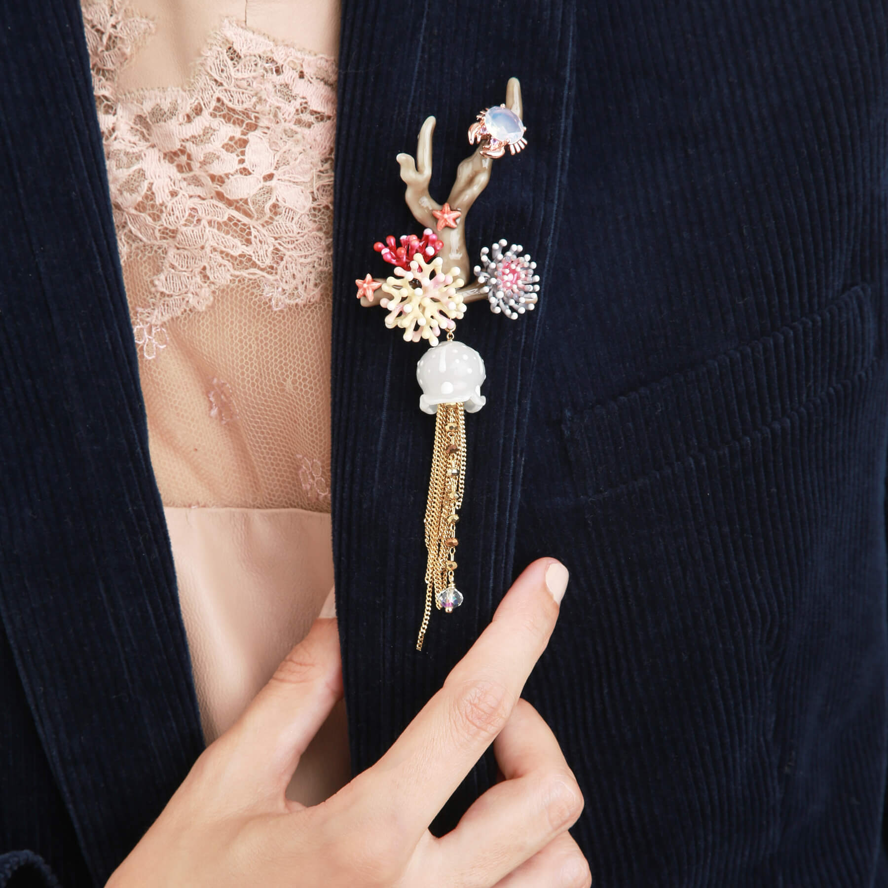 Brooch 13*4.5cm Gold plated brass, glass, hand cut crystals, hot technique enamels, handmade in Italy.