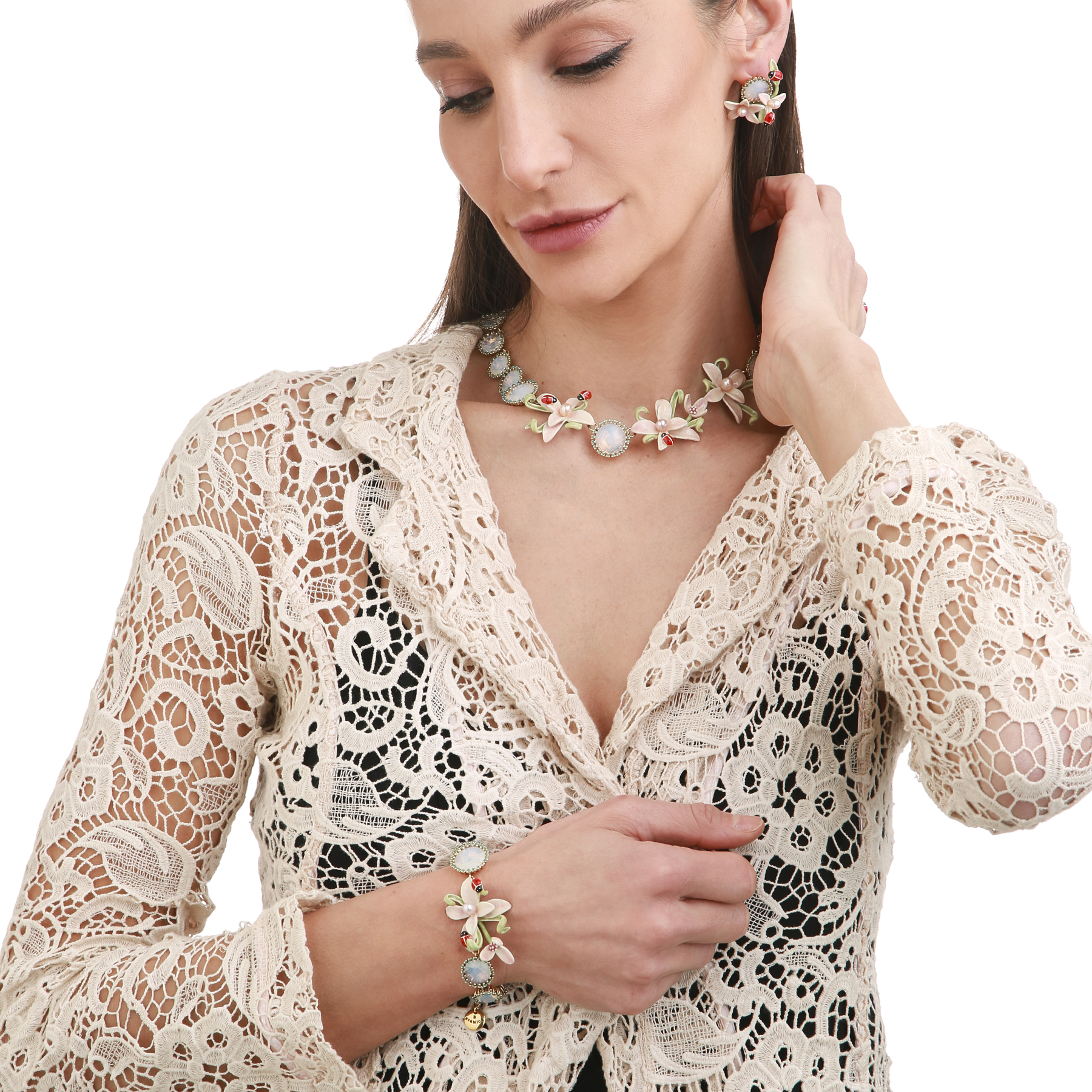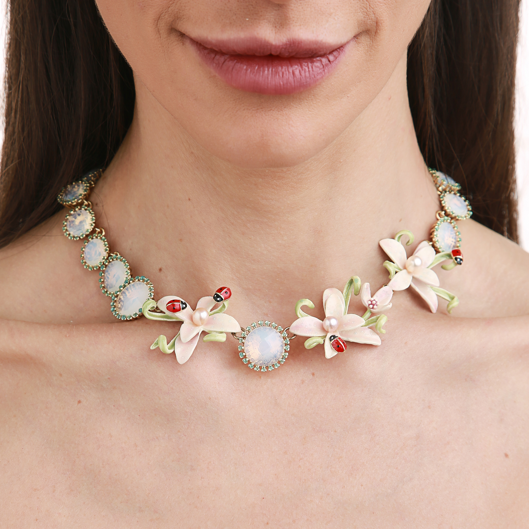 Gold plated brass, hand cut crystals, natural pearls, hot technique hand enamels, made in Italy.